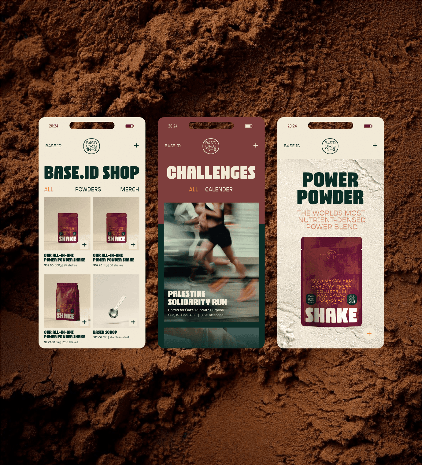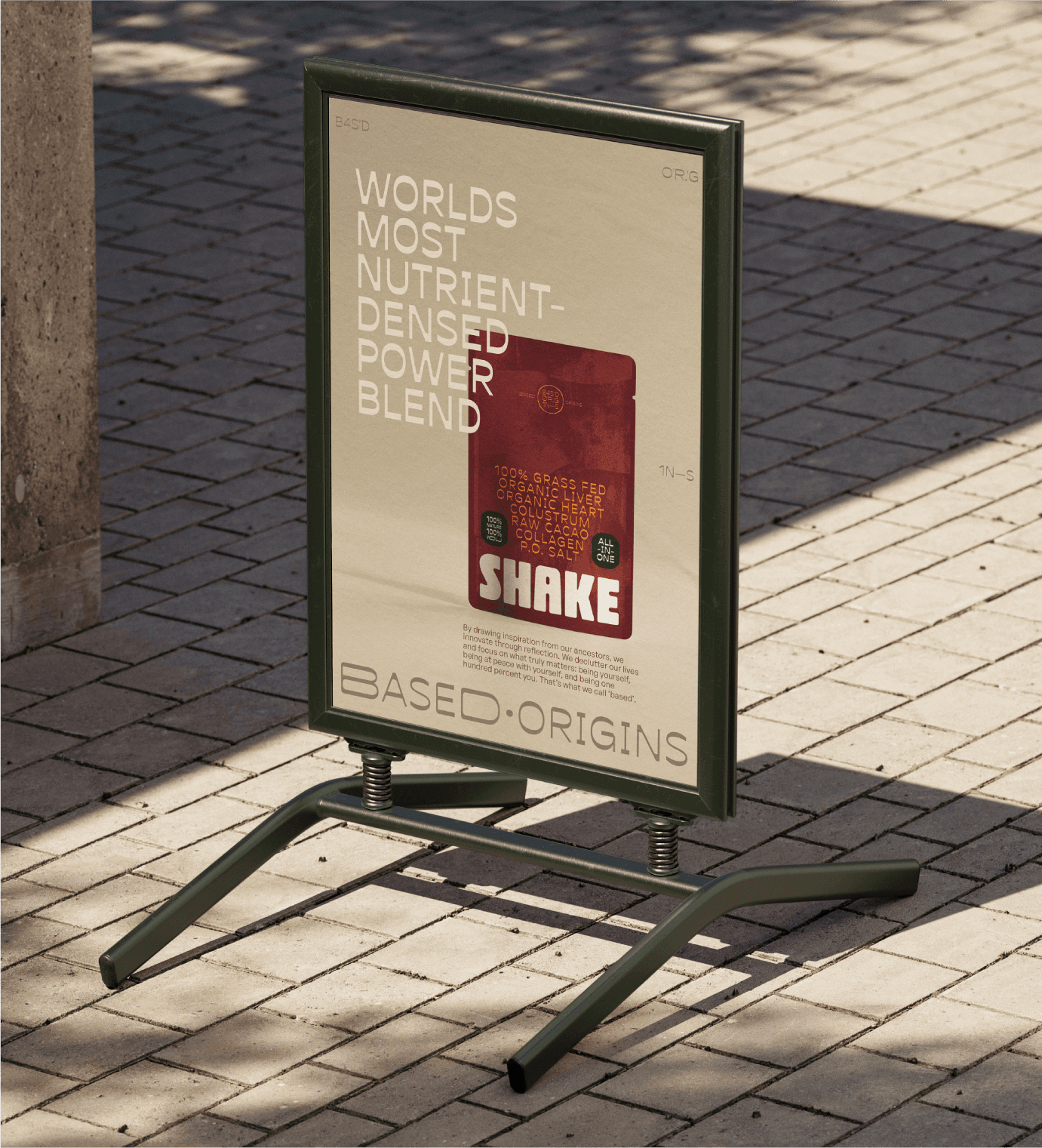 I designed a complete brand identity for this brand, which aims not only to sell a product but to build a community around the lifestyle concept of 'being based'. This includes packaging that stands out in the otherwise monotonous supplement aisle, emphasizing key features like 100% grass-fed animal ingredients, great taste, and the shake's powerful benefits